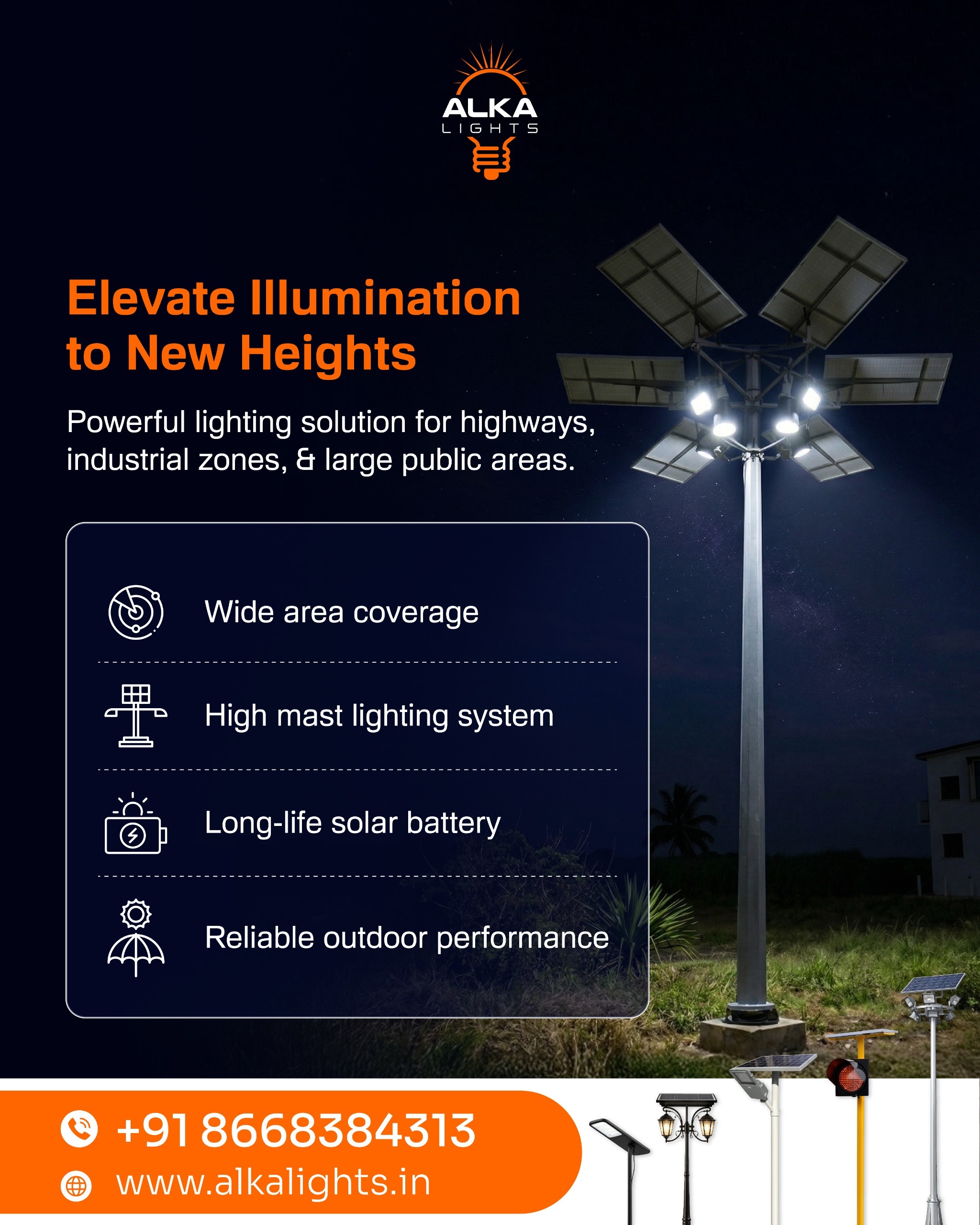 #AlkaLights #SolarLighting #HighMastLighting #SolarStreetLight #OutdoorLightingSolutions #LEDLightingIndia #SustainableLighting #GreenEnergySolutions #SolarPowerIndia #IndustrialLighting #HighwayLighting #SmartLighting #EnergyEfficient #SolarLEDLights