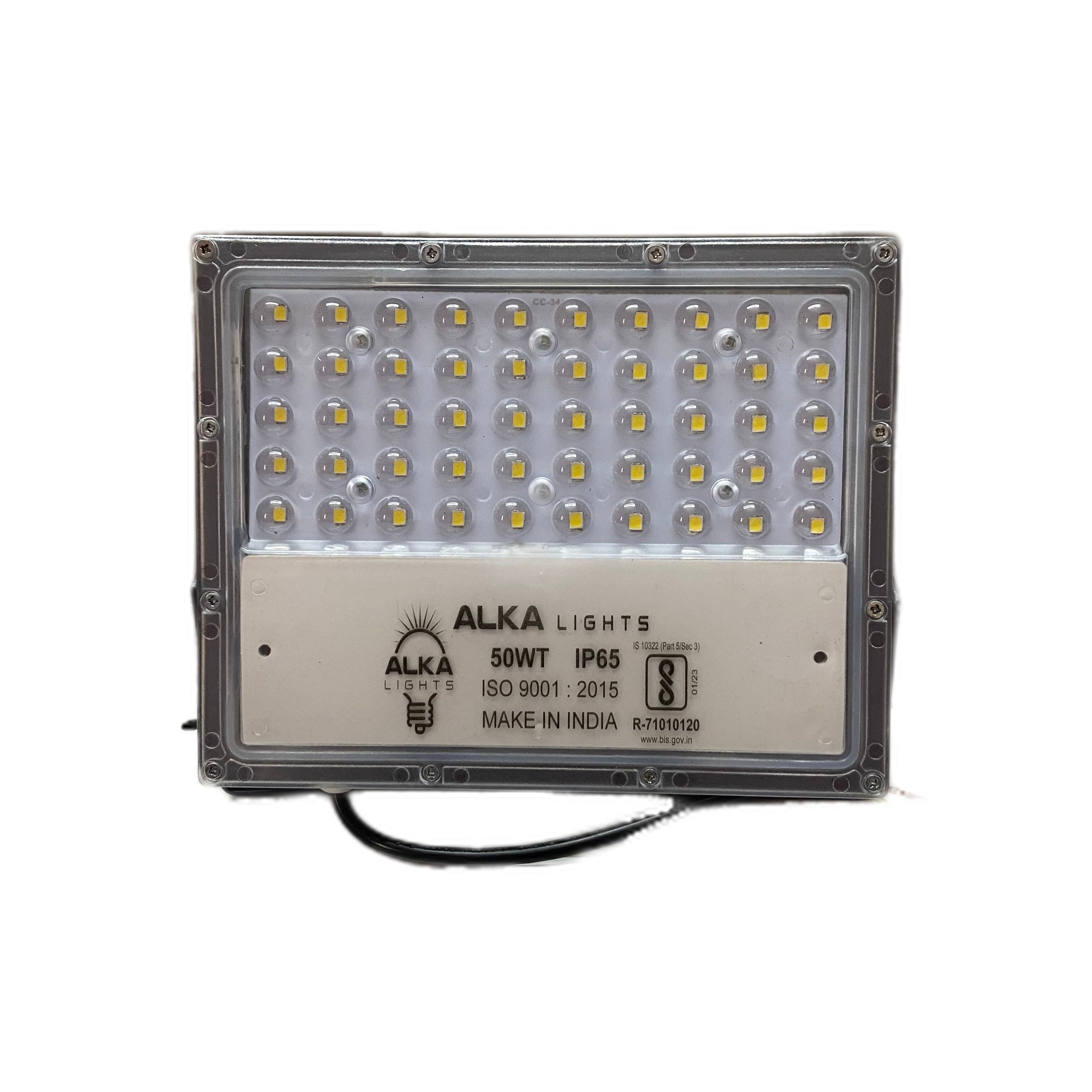 LED FLOOD LIGHT LENS MODEL 1. Make(Brand) : Alka Make 2. Input voltage : 90 V to 270 V 3. Rated watt : 50W (cool white/warm white) 4. LED type : SMD type High power LED ( 9v-1 Watt) 5. LED Make : everstar/bridglux/cree/osram. 6. LDE lamp efficacy : Min 130to 140 lumens/watt 7. Luminous flux : 130-140 LUMENS /WATT 8. Power factor : >0.95 9. No of hours usage / day : 10 to 12 hours/day 10. Surge protection : 6kva (internal) 11. Ingress protection : IP 65/IP 66 12. Total harmonic distortion (THD): < 15% 13. Color rendering index : Ra > 80 14. Working Temperature : 20 deg to 50 deg C 15. beam angle : 120 to 160 deg 16. Control Circuit : Compatible to LED 17. Lamp starting time : Not more than 5 sec 18. System power efficiency : > 85 % 19. Fixture : Pressure die cast Aluminum with toughened glass And waterproof fixture 20. Warranty : 2 Years(repairable)